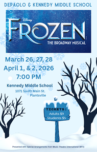 The Kennedy and DePaolo Middle School Drama Club will present this year’s production of “Frozen” at Kennedy Middle School on March 26, 27, 28, April 1, & 2 at 7:00 PM. Tickets are now available in the main office and they are only $5 for students and $9 for adults.
