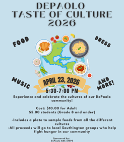 On Thursday, April 23, 2026 from 5:30-7:00 PM, ABC/STEPS will be sponsoring A TASTEOF CULTURE to celebrate the different cultures in our DePaolo community. To make it a great night we need your help! We need families willing to share their cultures with DePaolo. Consider hosting a booth where you can share information, items and food from your culture. Or maybe you have a talent you would like to share. All are welcome to help and attend.