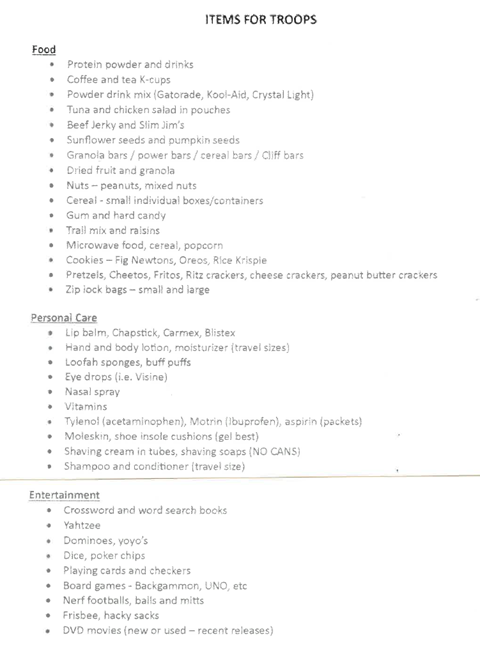 The town of Southington Veterans Committee and the American Legion Auxiliary are sponsoring an ongoing care packet event for our Southington Armory troops that have been deployed to the Middle East for 6-12 months. Please help us support them with food, personal care and entertainment items. Please see below for a detailed list. Donations can be brought to the Main Office. Thank you for all your support!